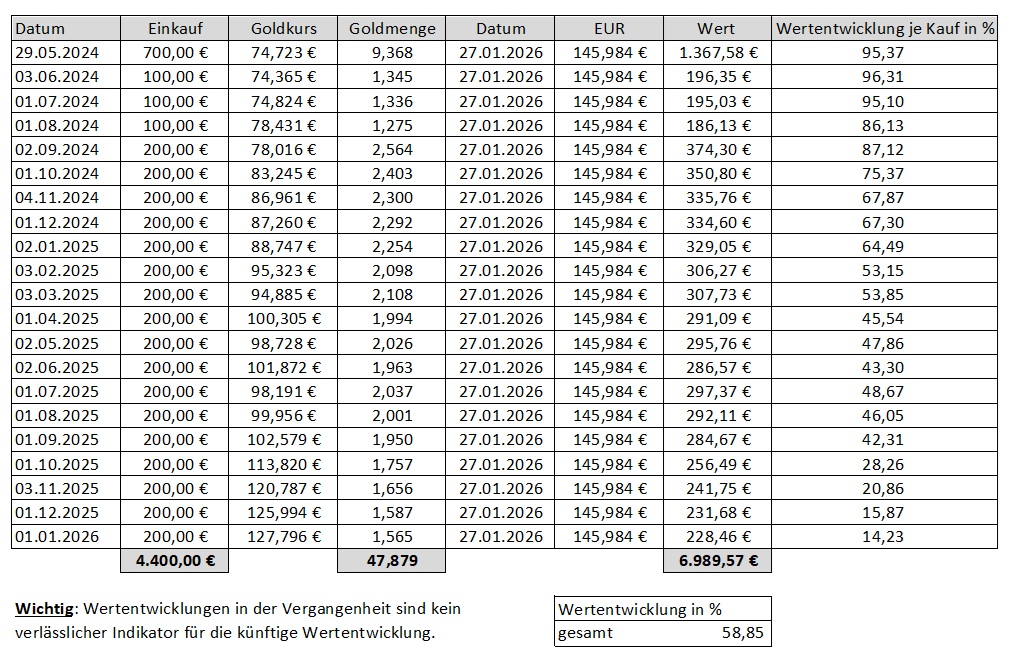 Lösung: Monatlich sparen mit kostenfreier Lieferung zu Ihnen nach Hause, wenn 10g angespart sind. Wie das geht? Zeige ich Ihnen gerne und zwar in Zahlen in der Tabelle, die einem konkreten Kundenvertrag entnommen sind, der Ende Mai 2024 mit dem Sparplan begonnen hat.